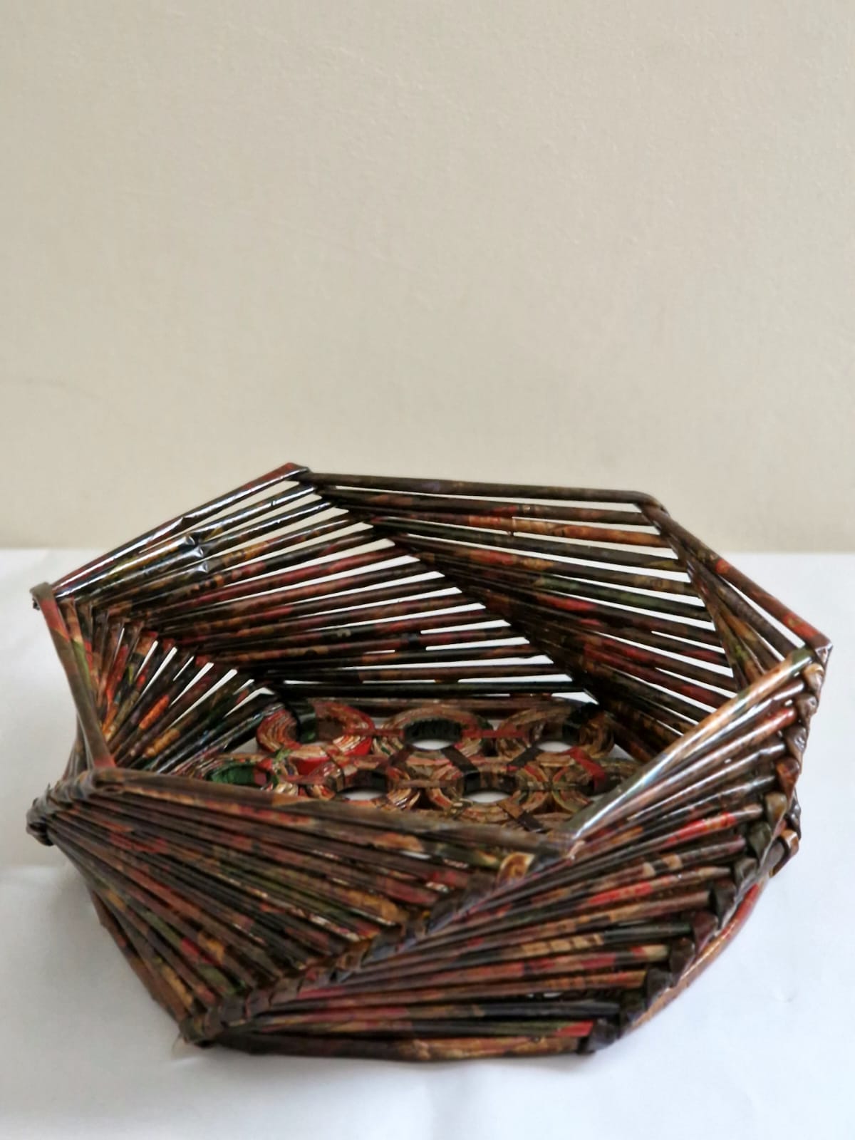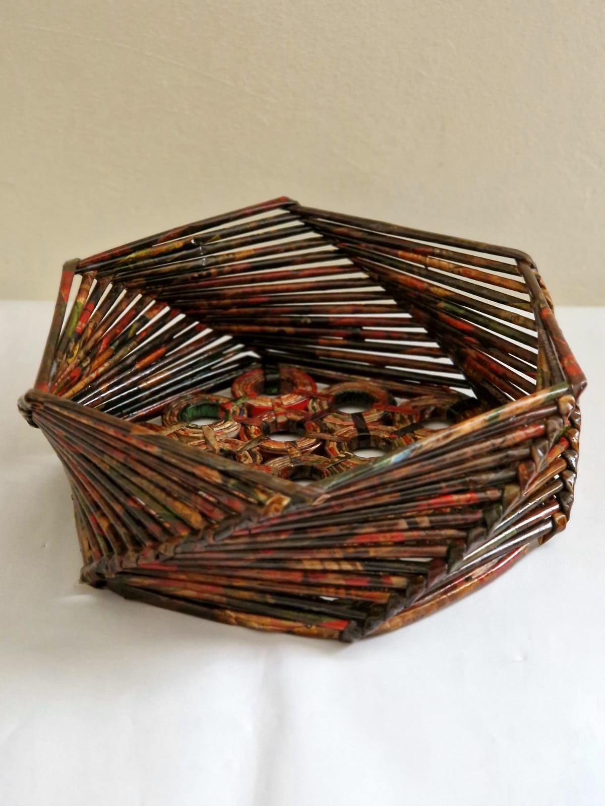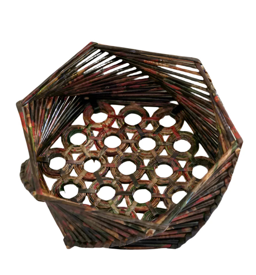 Acest coș original, cu design geometric și detalii atent lucrate, este realizat manual din hârtie reciclată, răsucită și lăcuită pentru durabilitate și un aspect lucios elegant. Ideal pentru depozitarea obiectelor sau ca piesă decorativă cu aer rustic și ecologic.